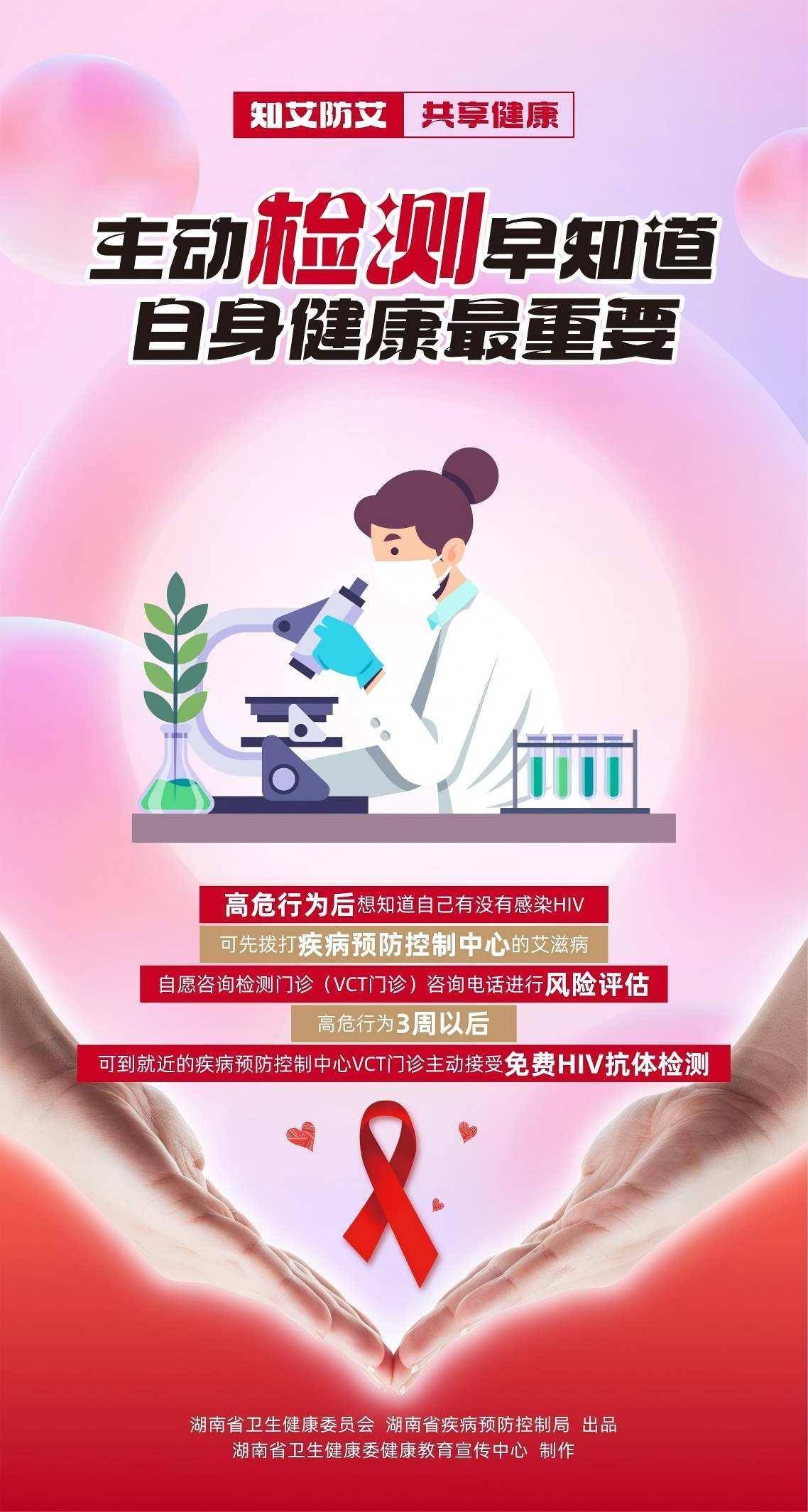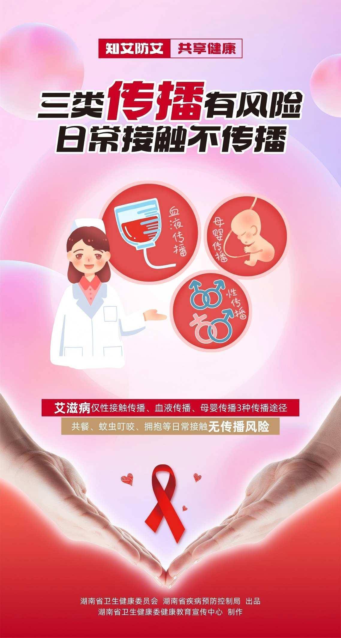 “知艾防艾,共享健康”宣传海报。单位供图2025年12月1日是第38个世界艾滋病日,湖南省卫生健康委推出“知艾防艾,共享健康”系列宣传海报,呼吁全社会共同参与,构筑艾滋病防治屏障。该系列海报阐述了艾滋病的病毒特性、三大传播途径、预防措施及检测治疗等核心知识,借助简明图文消除公众认知误区,着重强调“早检测、早发现、早治疗”的科学防治策略,并倡导消除对艾滋病感染者的社会歧视。(何冰 罗惟)